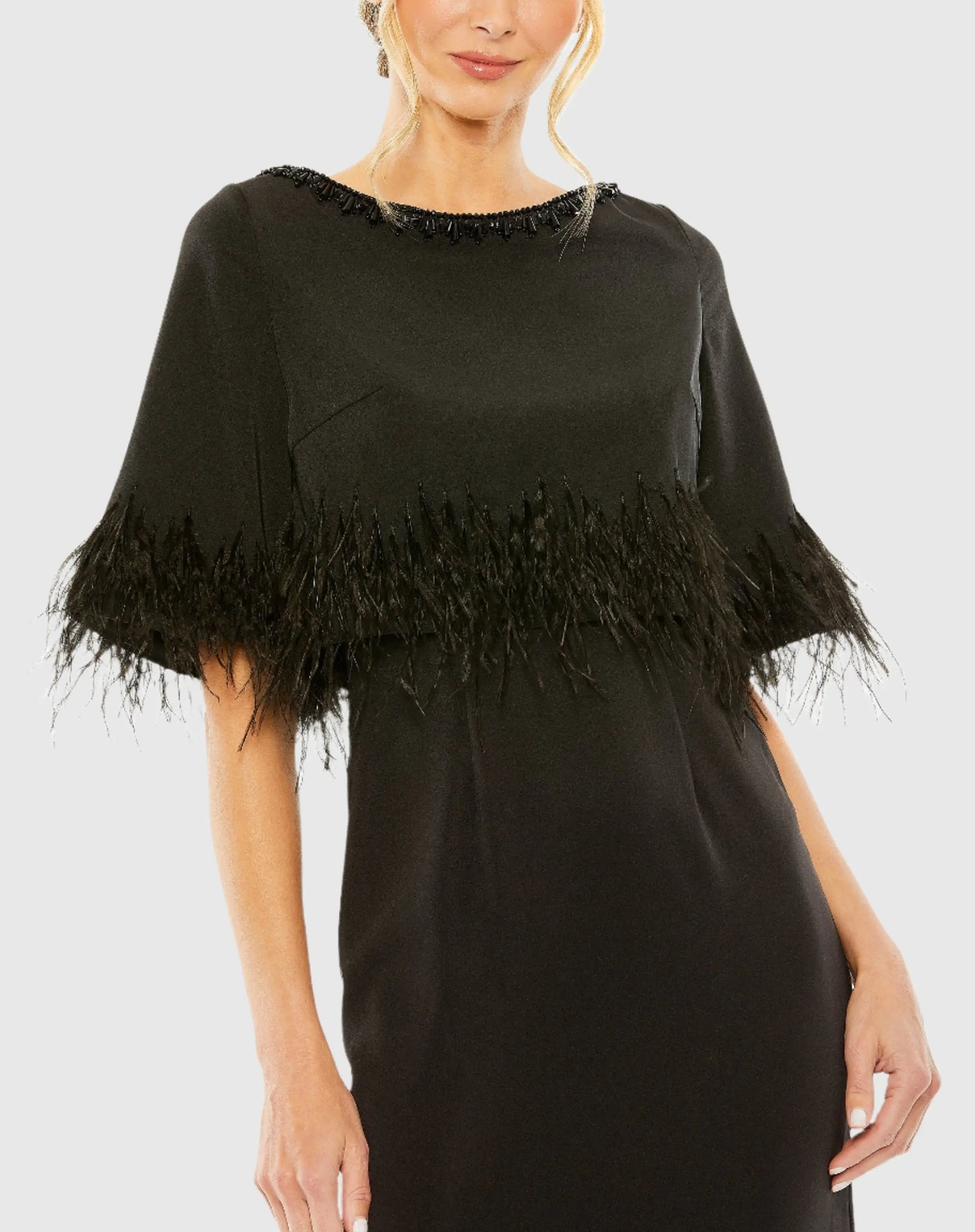 Timeless glamour meets modern allure in this beautiful taffeta dress. Featuring short sleeves adorned with feather trim, a shimmering beaded neckline, and a sleek silhouette, this dress is perfect for any special occasion.