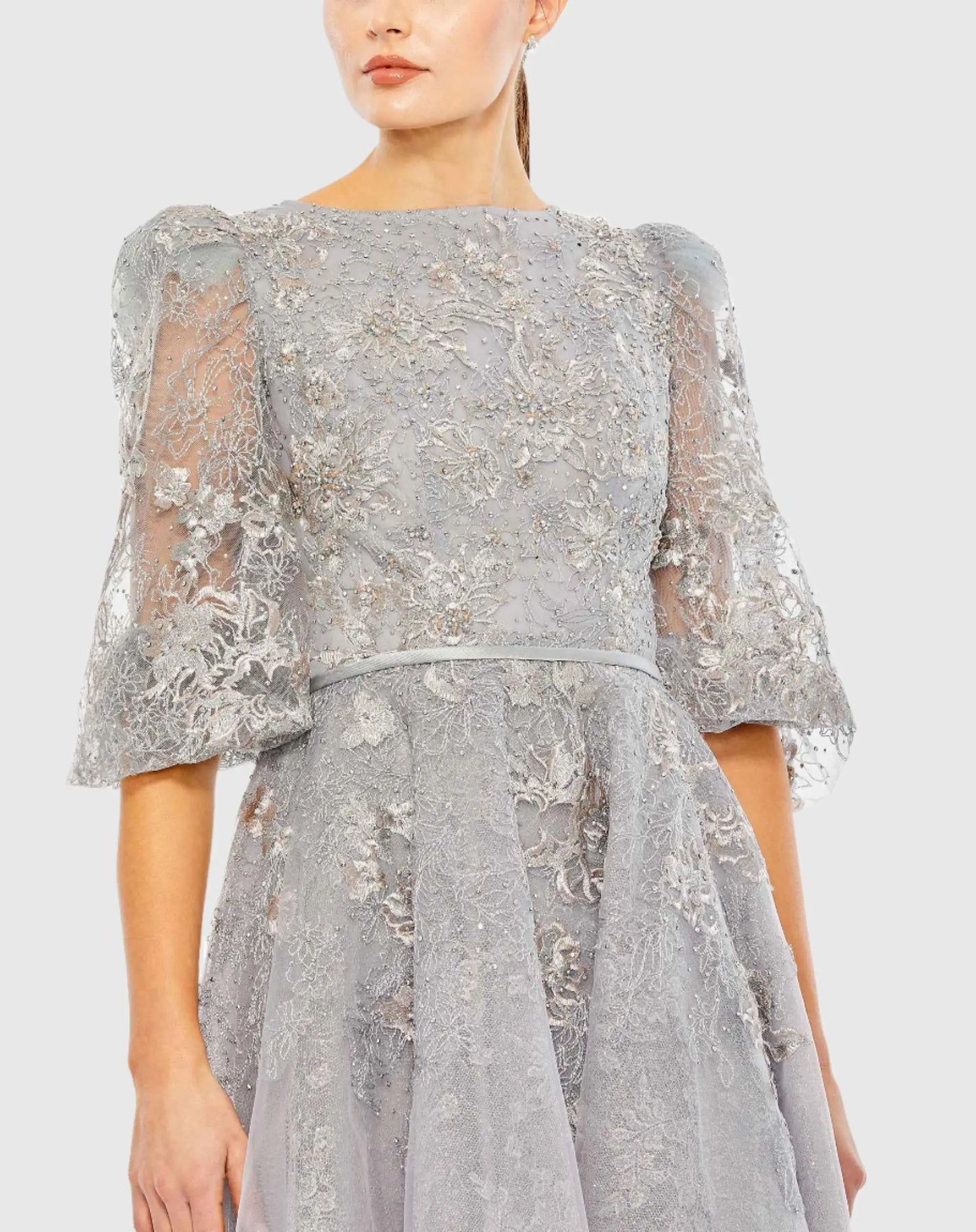 Gray High Neck Puff Sleeve Embellished Dress