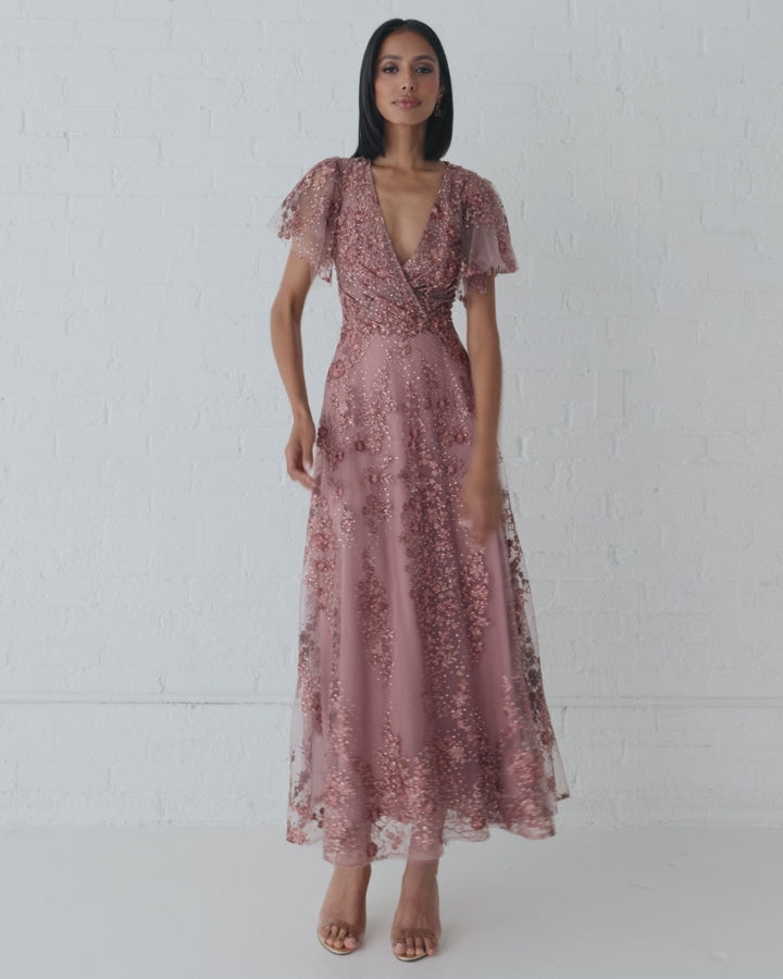 This elegant embroidered a line dress features a faux-wrap bodice, flutter sleeves, and heat-set rhinestones for subtle sparkle throughout.
