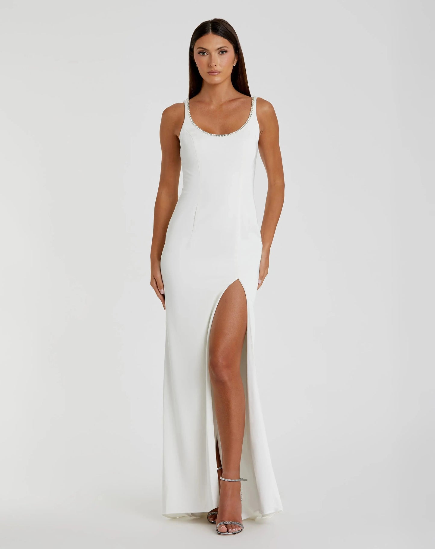 White Sleeveless Crystal Scoop Neckline Column Gown with High Slit