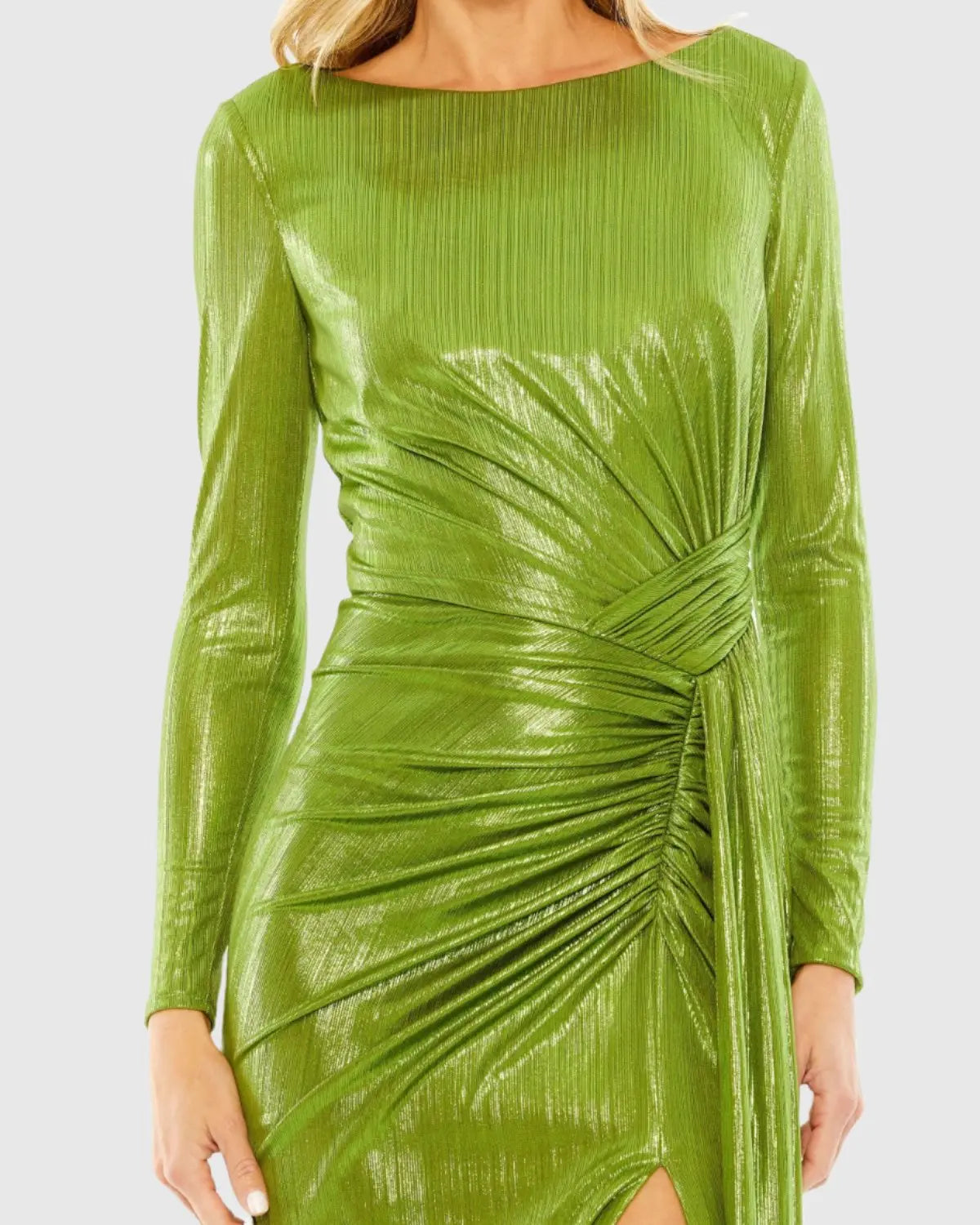 Green Long Sleeve Gathered Waist Metallic Gown