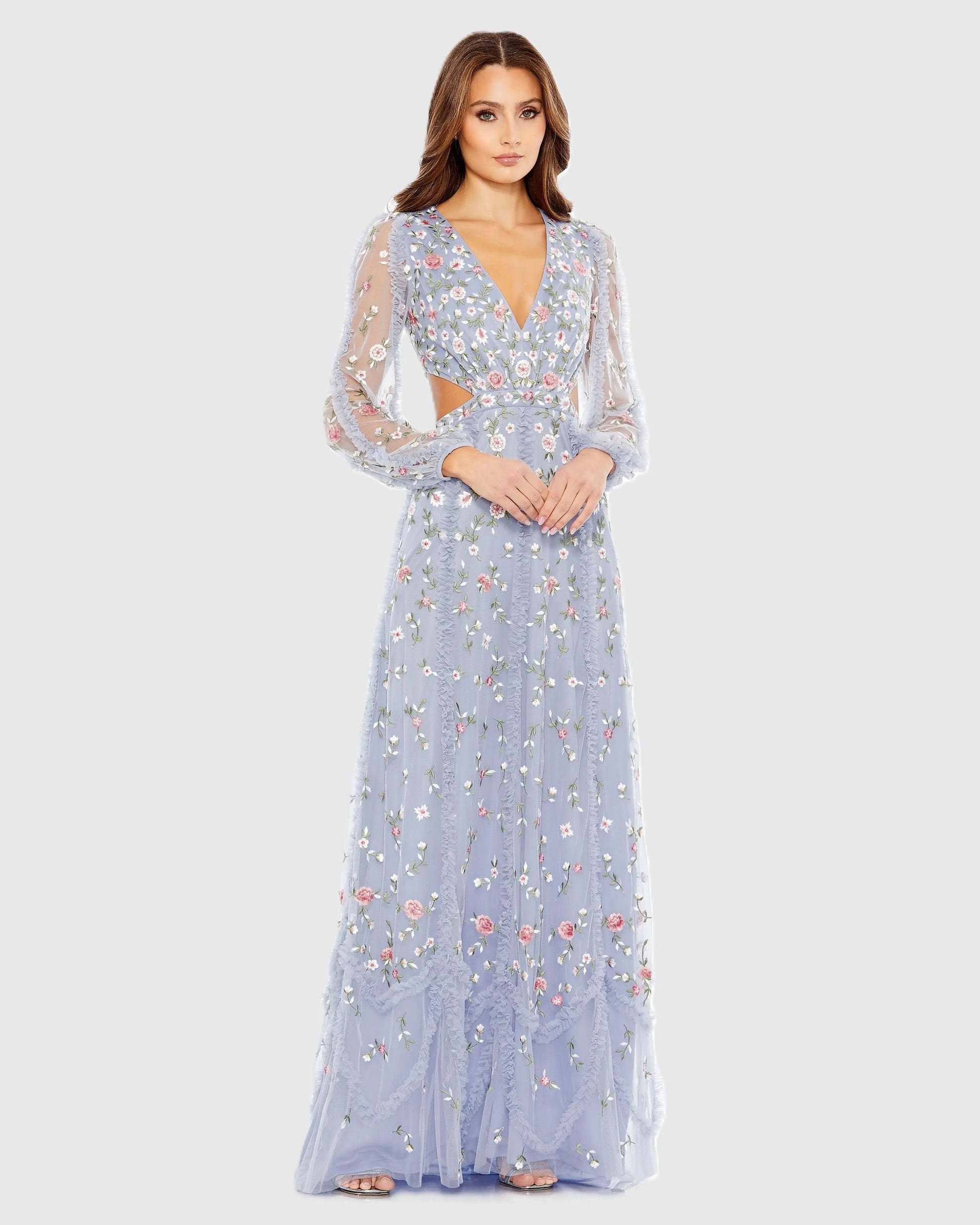 Purple Long Sleeve Embellished Cut Out A-Line Gown