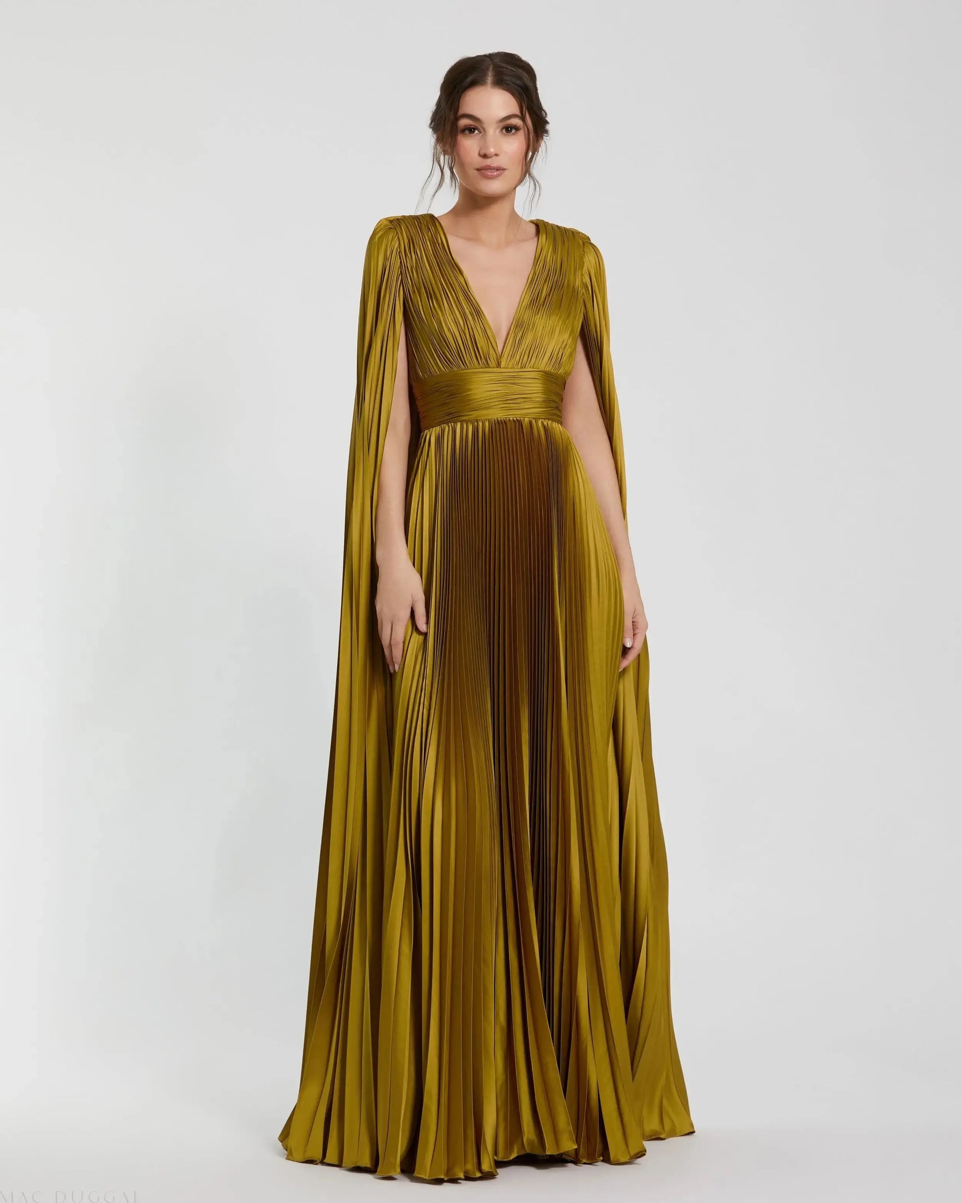 Perfect for any formal occasion, this gown exudes timeless elegance. The fabric drapes beautifully, creating a flattering silhouette, while the cape sleeves add a touch of sophistication.