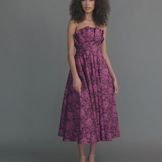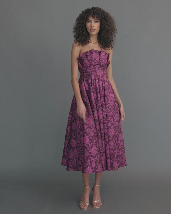 Modern charm meets timeless glamour in this beautiful brocade midi dress. Featuring a strapless neckline, box-pleats, and a classic a-line silhouette, it's the perfect cocktail party dress.