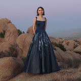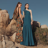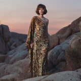 Sequin gown with v-neckline, ruched detailing, and draped short sleeves.