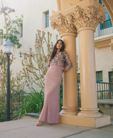 One-shoulder metallic brocade ball gown accented with a thigh-high slit and pockets.