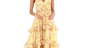 Floral tiered chiffon gown with a pleated bodice, v-neckline, and spaghetti straps. The full, flowy skirt features delicate ruffle detailing, and the waist is accented with a hand-beaded belt.