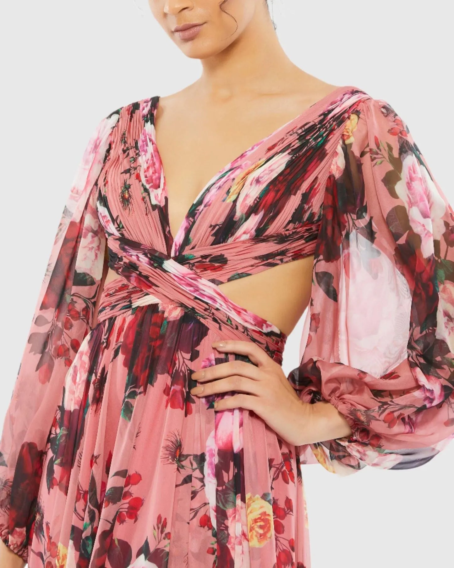 This ethereal floral dress features a pleated bodice with a plunging v-neckline, sexy side cutouts, and an exposed lace-up back. Sheer blouson sleeves are complimented by a flowy tiered floor-length skirt.