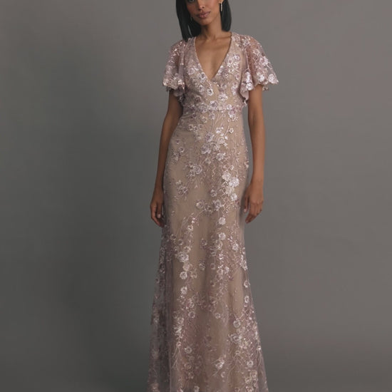 This stunning lace gown features a feminine neckline, short butterfly sleeves, and subtle floral sequin embellishments, making it a perfect, timeless choice for any formal occasion.