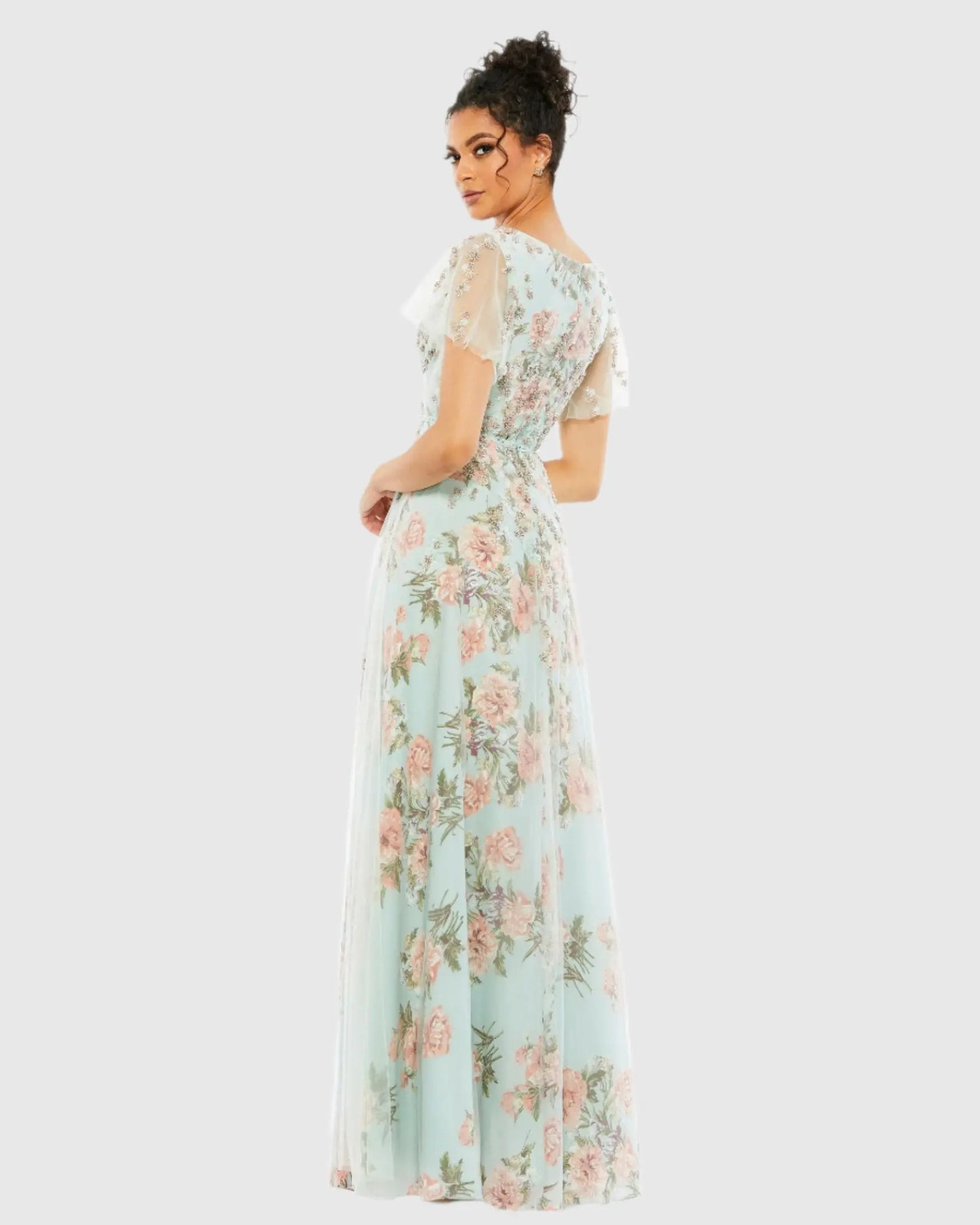 Floral printed gown with a pleated faux-wrap bodice, v-neckline, and floor-length skirt. Delicate mesh flutter sleeves and mesh overlay feature intricate beaded accents, and the natural waist is defined by a thin hand-beaded belt.
