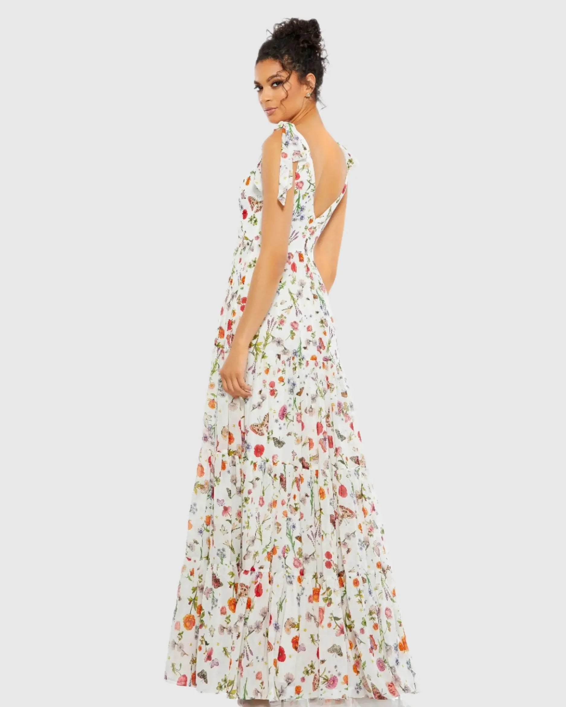 White Floral Print Sleeveless Soft Tie Shoulder Gown