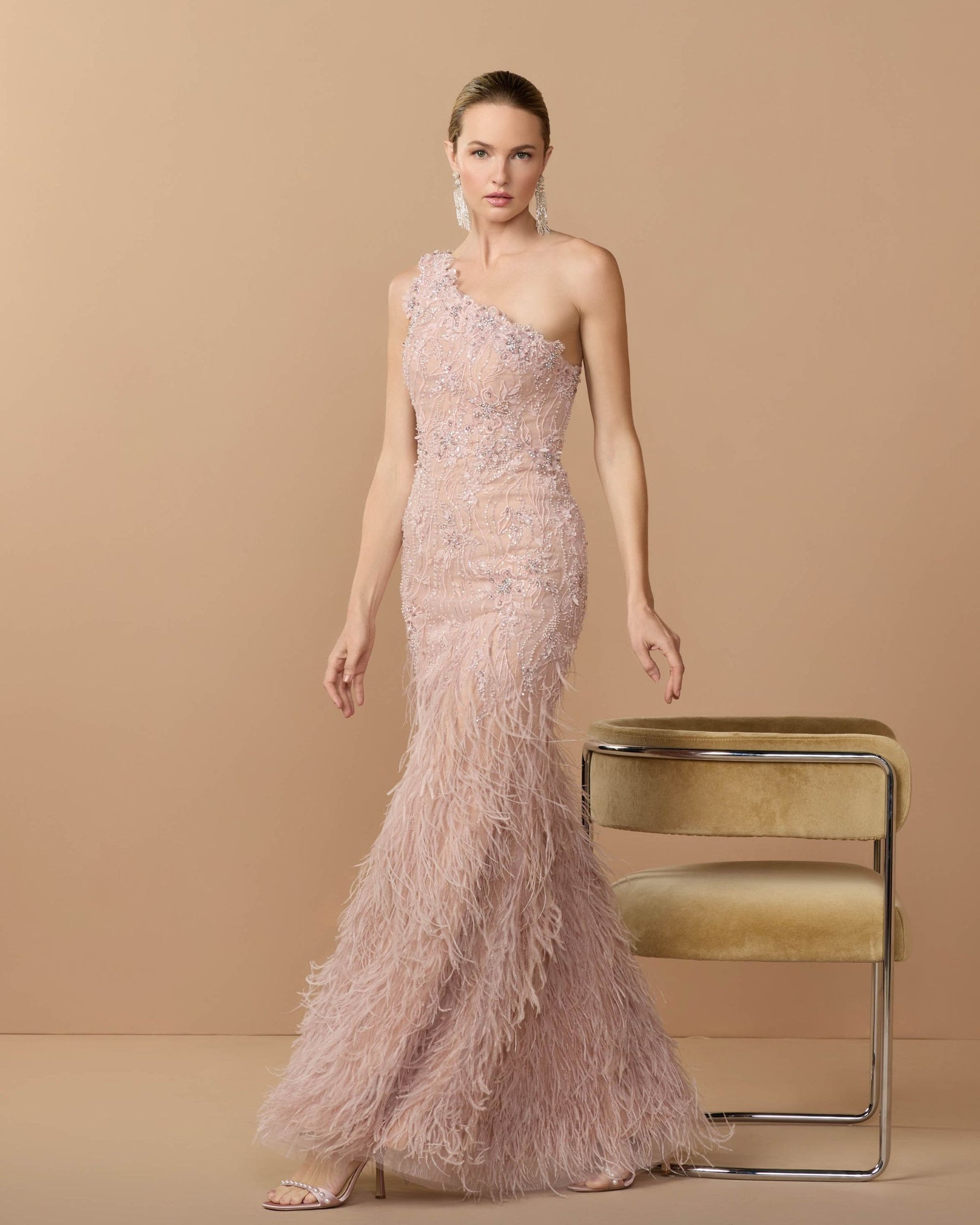 This exquisite one shoulder gown is a vison of modern luxury. Crafted in a soft blush hue, it features floral embroidery and intricate sequin and beaded embellishments. Finished with dramatic feathered hem, this gown is designed for unforgettable entrances.