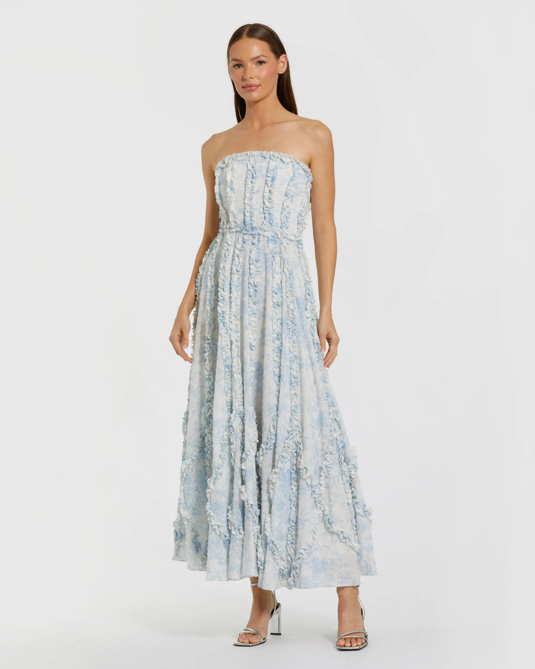 Blue and White Strapless Ruffle Floral Cotton Midi Dress