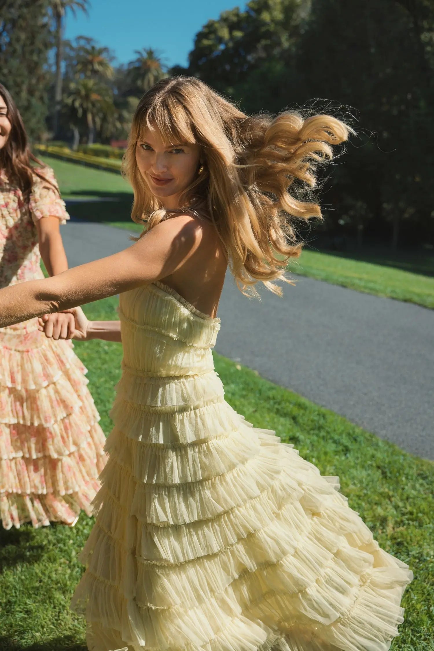 Yellow Mesh Micro Ruffle Strapless Midi Dress