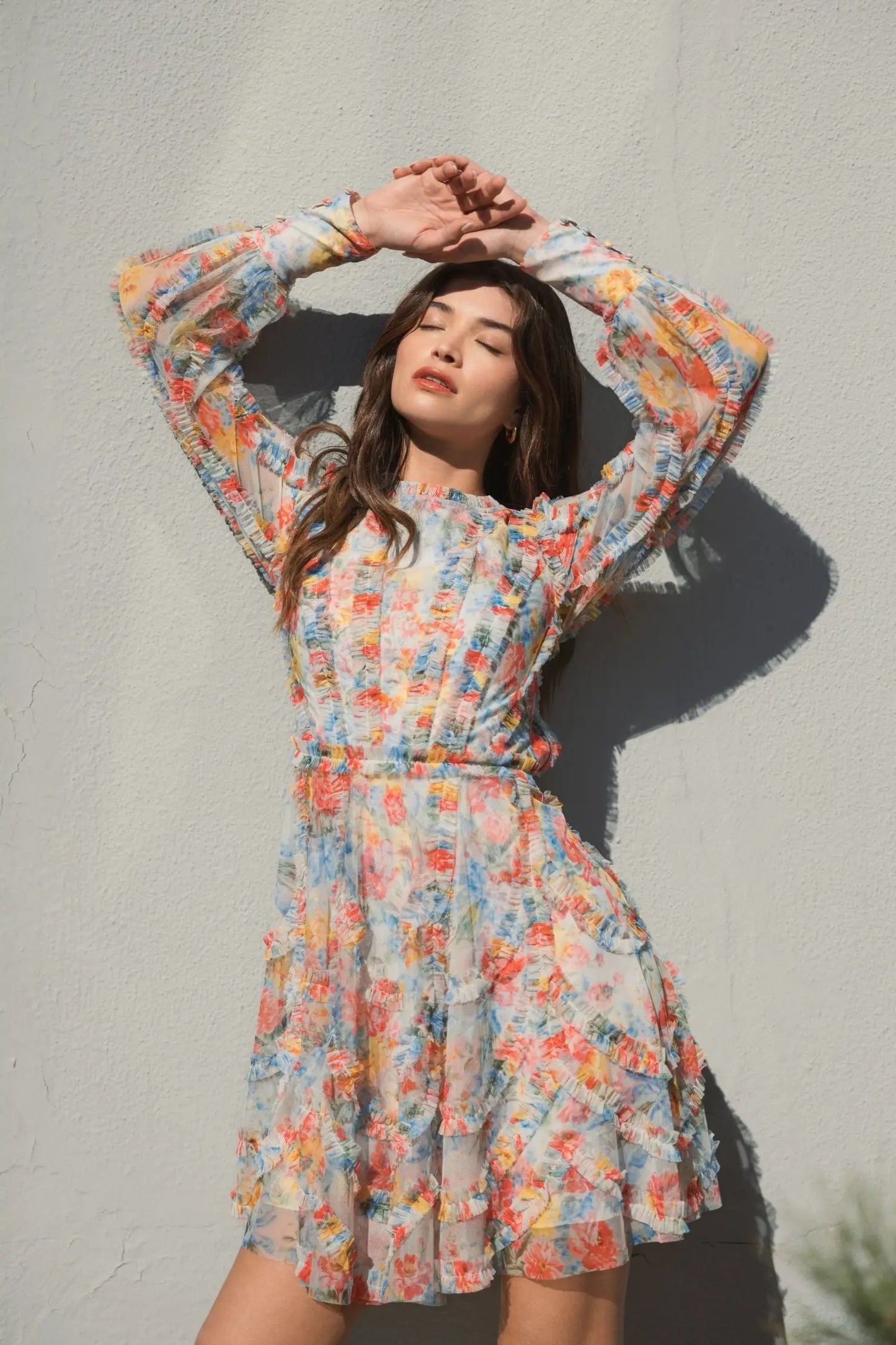Turn heads in this vibrant floral mini dress with long, romantic puff sleeves, baby ruffles, and a lace-up back, blending elegance and playfulness for luncheons, soirées, and daytime events.