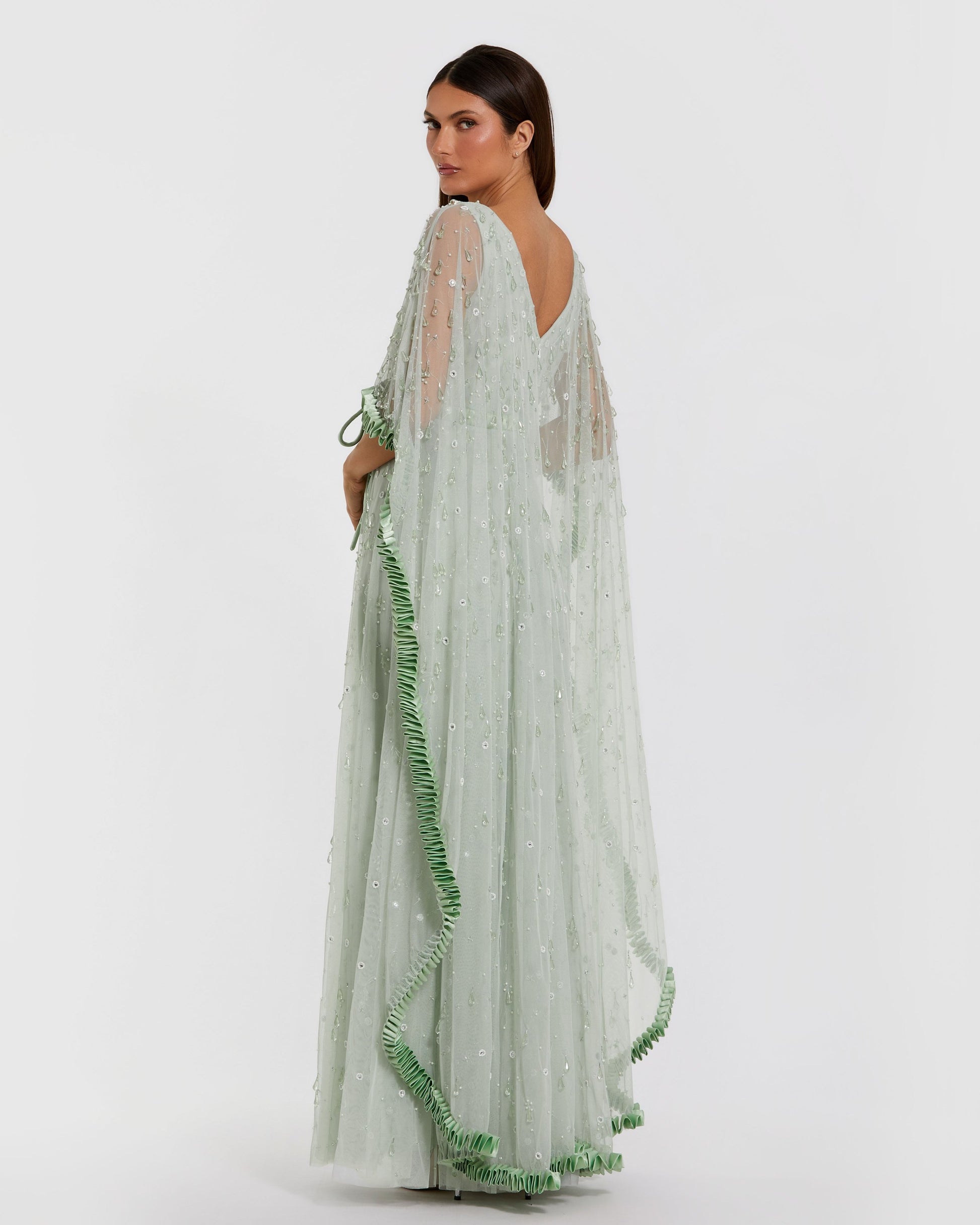 Green Beaded Cape Sleeve Gown with Ruffle Trim