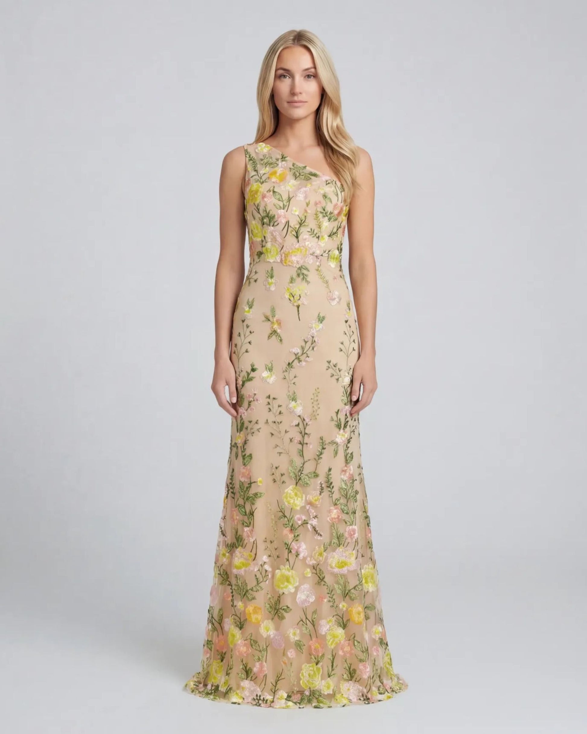 Embrace ethereal elegance in this one shoulder lace embroidered gown. Adorned with intricate floral embroidery and a sleek one shoulder neckline, this gown is perfect for weddings and other special occasions.