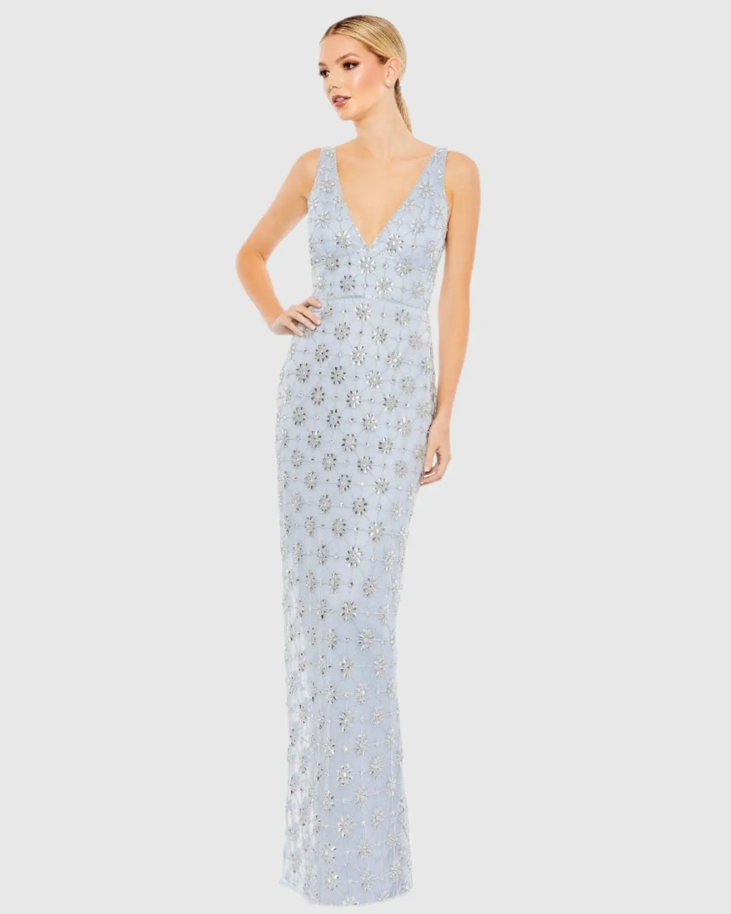 Turn heads in this stunning blue dress, crafted from hand-embellished mesh fabric. Featuring a flattering v-neckline, eye-catching floral embellishments, and a column silhouette, this gown is perfect for formal events, and special occasions.